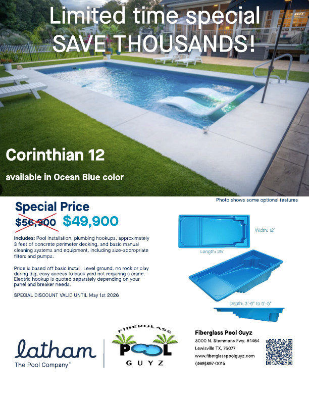 Fiberglass Pool Guyz serves the surrounding DFW Metroplex including Lewisville, Addison, Allen, Argyle, Arlington, Aubrey, Bedford, Carrollton, Celina, Colleyville, Coppell, Dallas, Denton, Double Oak, Euless, Farmers Branch, Flower Mound, Frisco, Garland, Grand Prairie, Grapevine, Haslet, Highland Village, Hurst, Irving, Justin, Keller, Lake Dallas, Lancaster, Little Elm, McKinney, Northlake, Oak Point, Plano, Ponder, Prosper, Richardson, Roanoke, Rowlett, Sachse, Sanger, Southlake, The Colony, Wylie, Bartonville, Copper Canyon, Shady Shores, Hebron, Trophy Club, and Fort Worth.